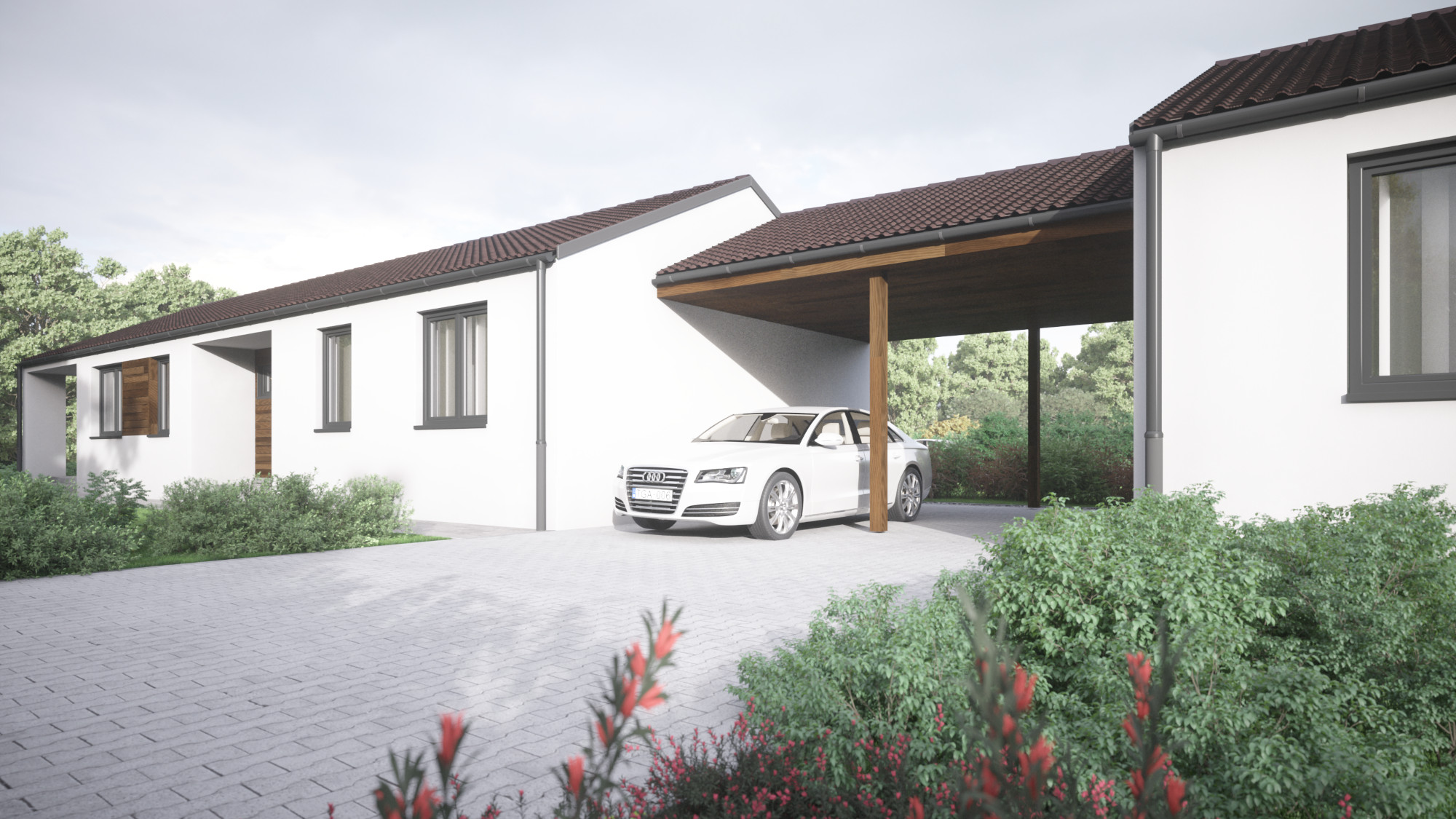 A keskeny telekszélességhez igazodva a lakásokat egymás mögötti elrendezésben terveztük. A fedett gépkocsitárolókat a két lakórész között helyeztük el, ezzel a semleges funkcióval hatékonyan elválasztva a lakások kerthasználati területét.