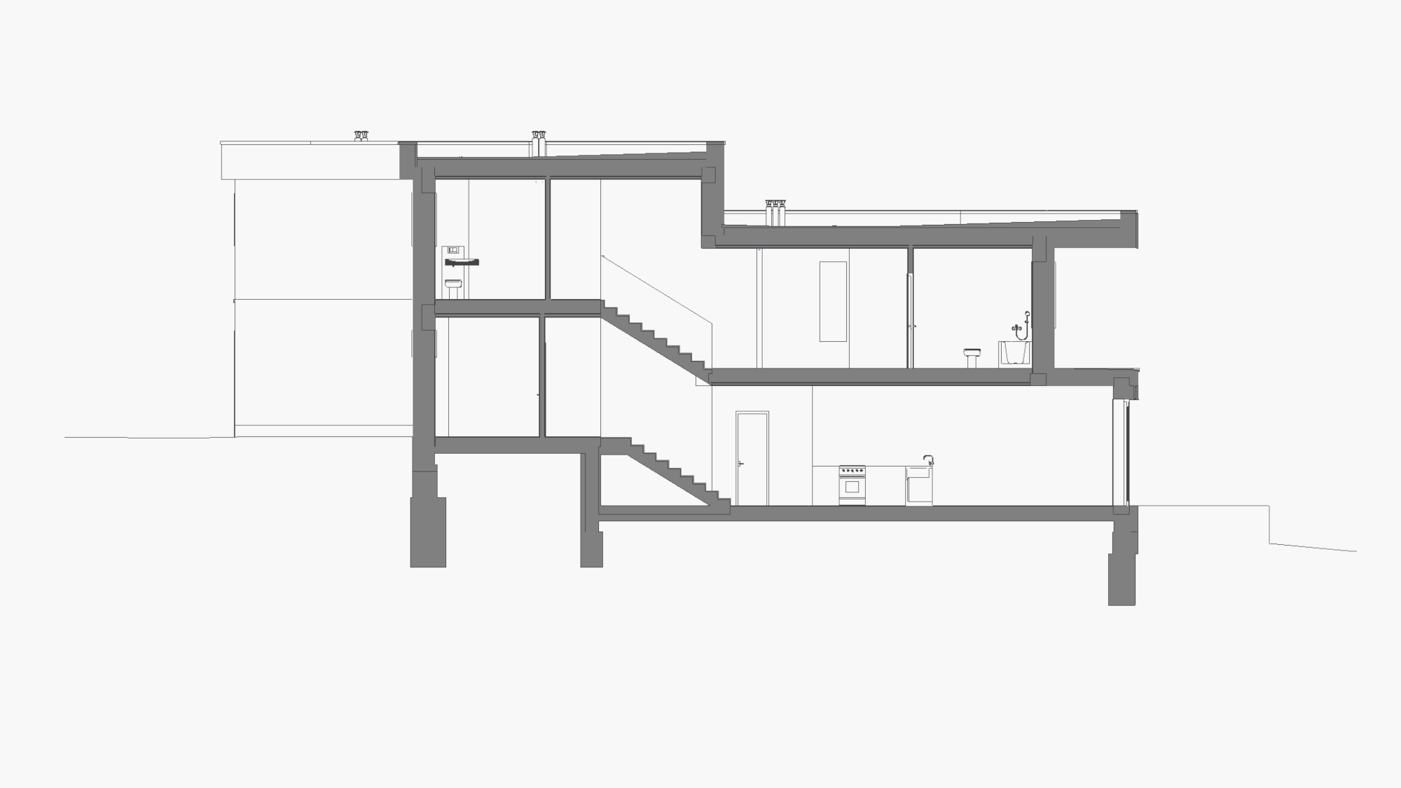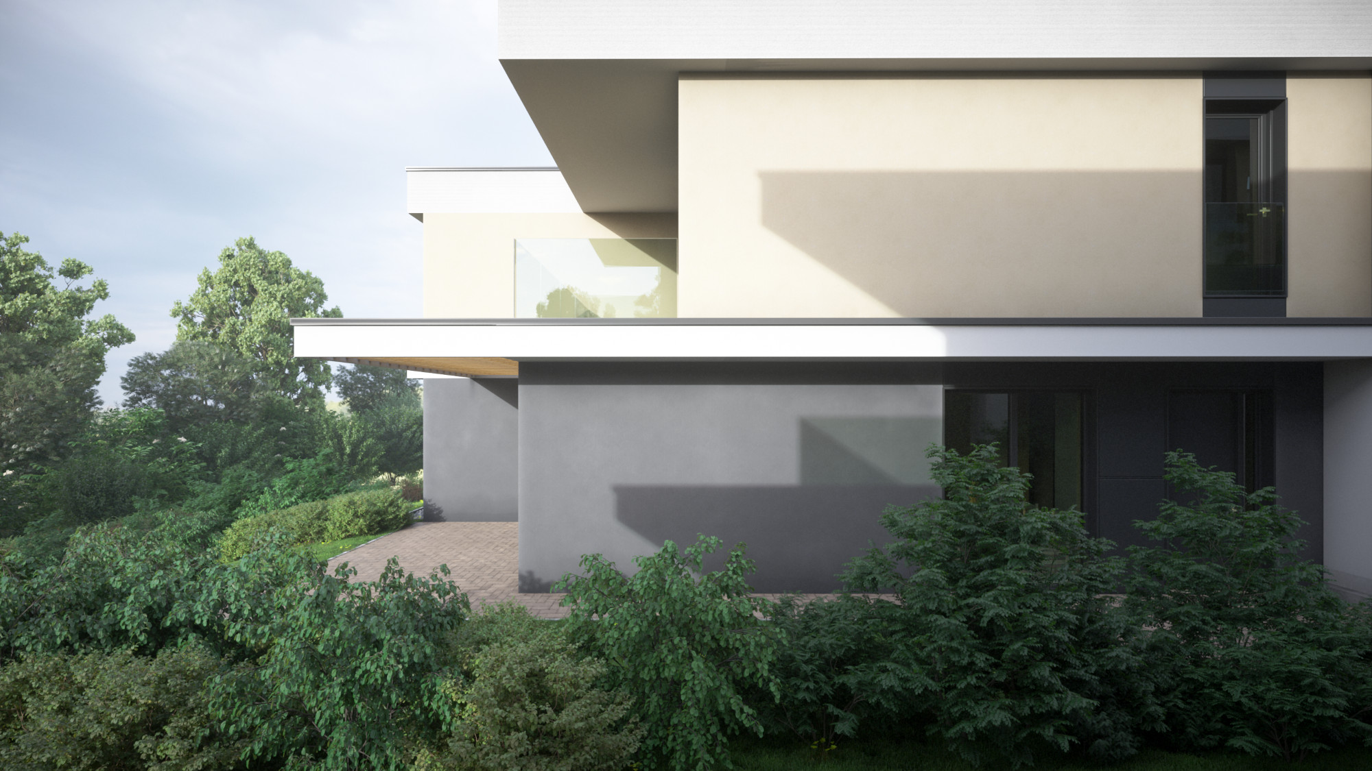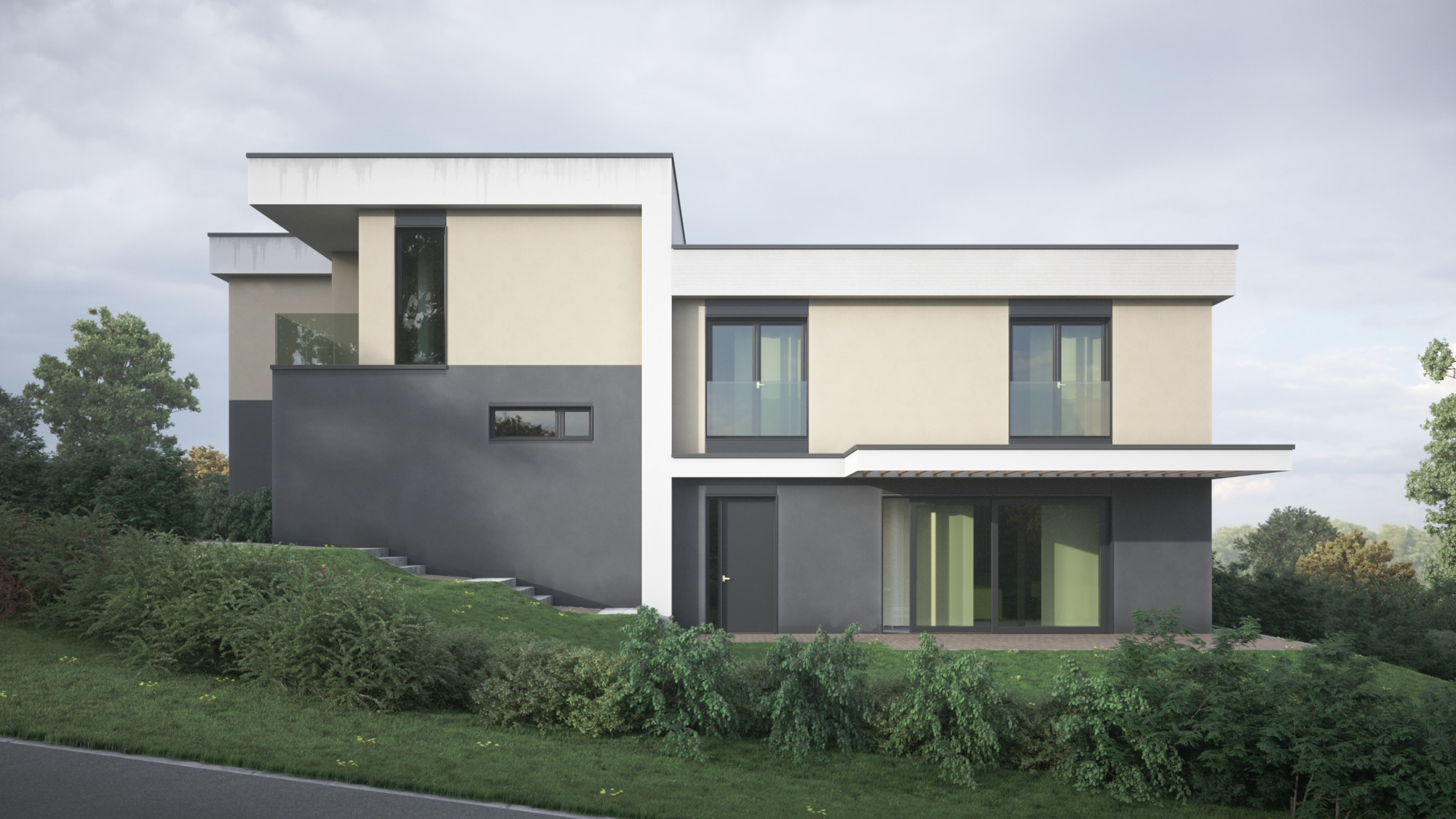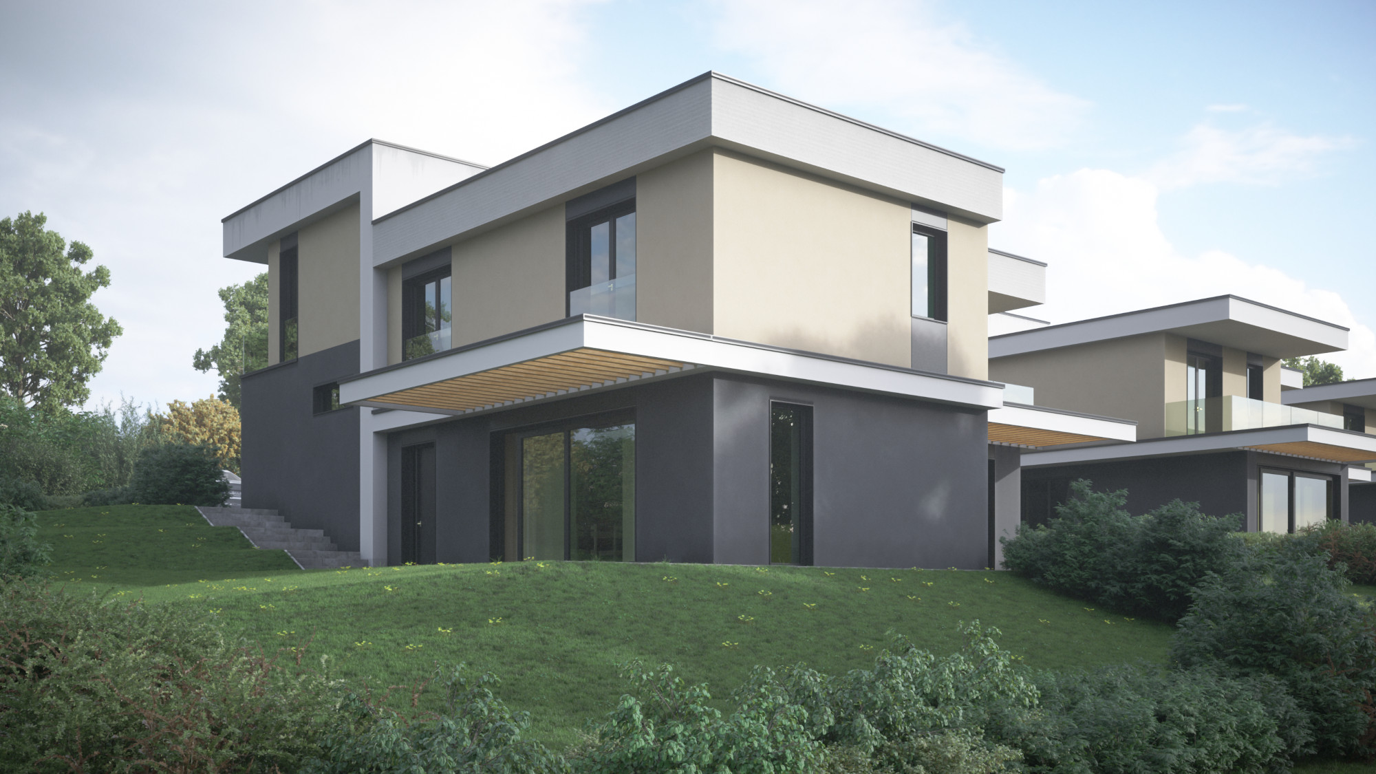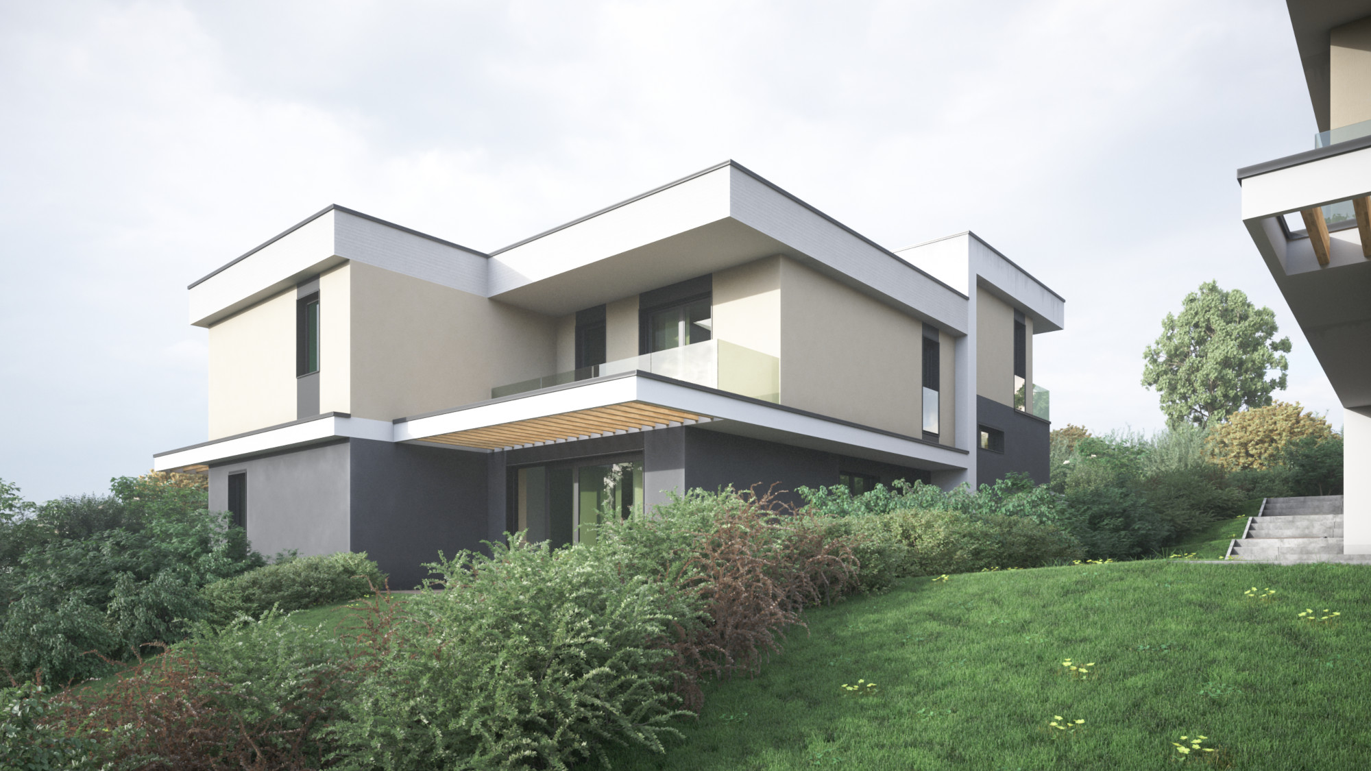 A déli irányban lejtős telken az emeletes, lapostetős épületeket a terepviszonyokhoz alkalmazkodva szinteltolással telepítettük. A déli irányban ereszkedő lépcsőzetes elrendezés mozgalmas tömegformálást tett lehetővé és biztosította a déli tájolású teraszok és a kapcsolódó helyiségek kedvező benapozását.