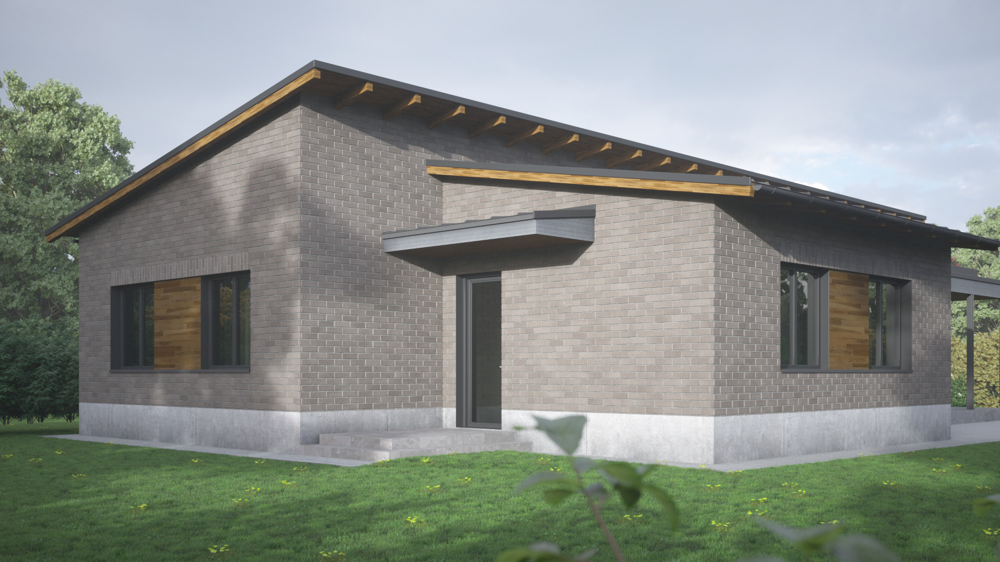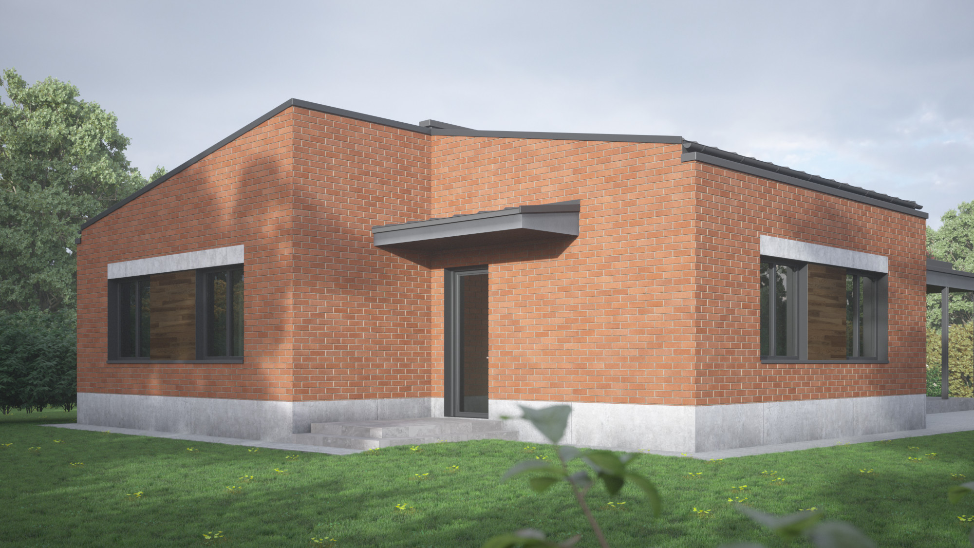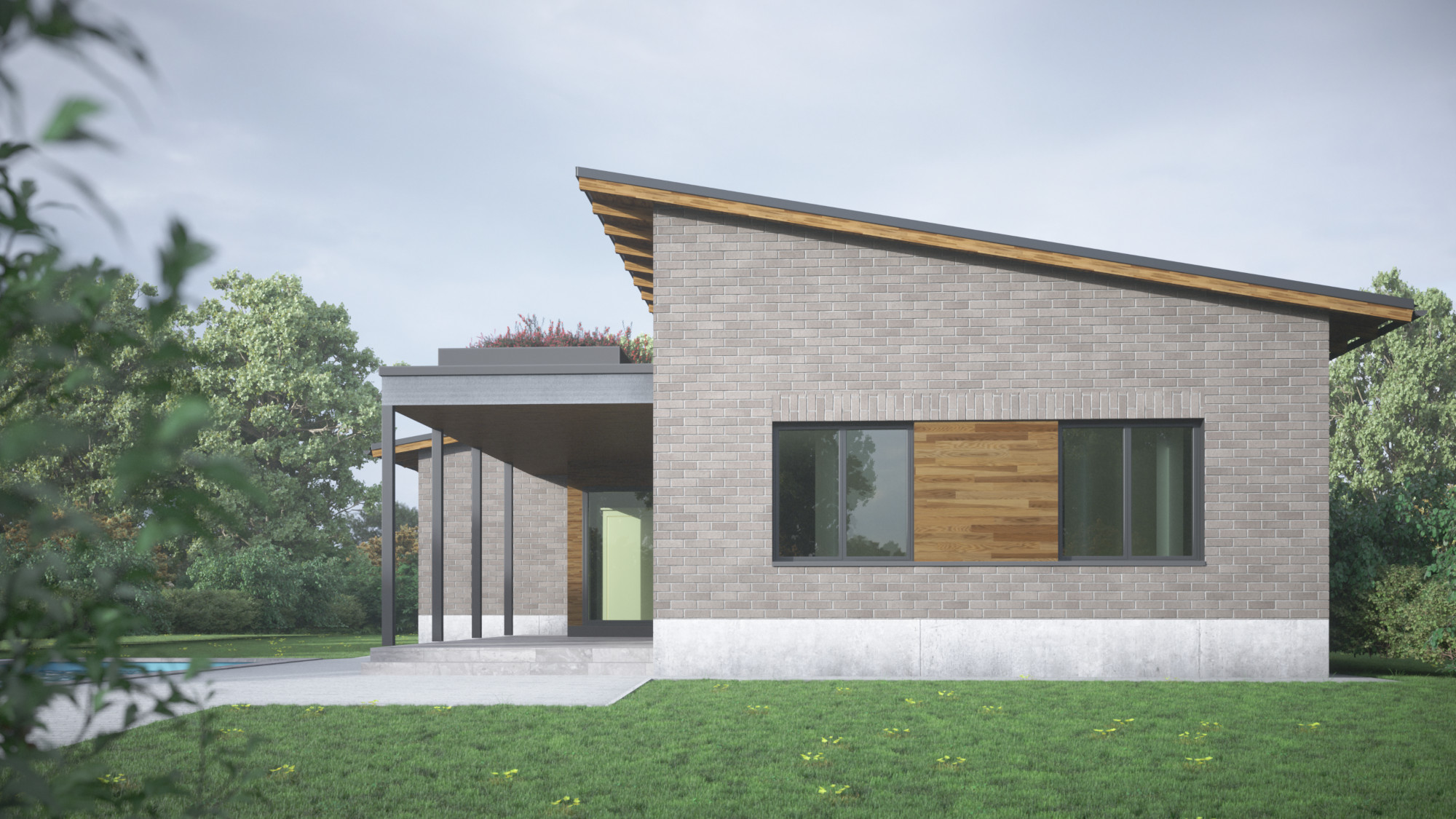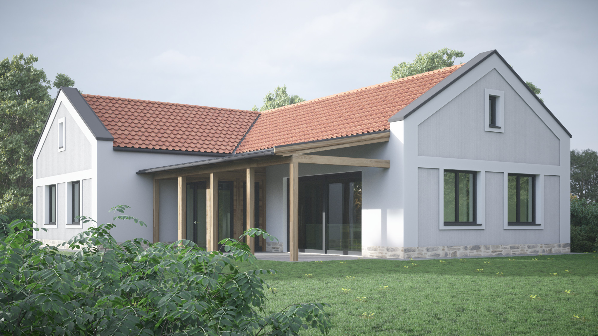 Több változatban készítettünk tervvázlatokat egy földszintes elrendezésű családi házra. Megrendelőnk kérésére különböző építészeti stílusokat próbáltunk ki ugyanarra az alaprajzi beosztásra, bemutatva, hogyan formálja az épület karakterét a homlokzatképzés és az anyaghasználat.