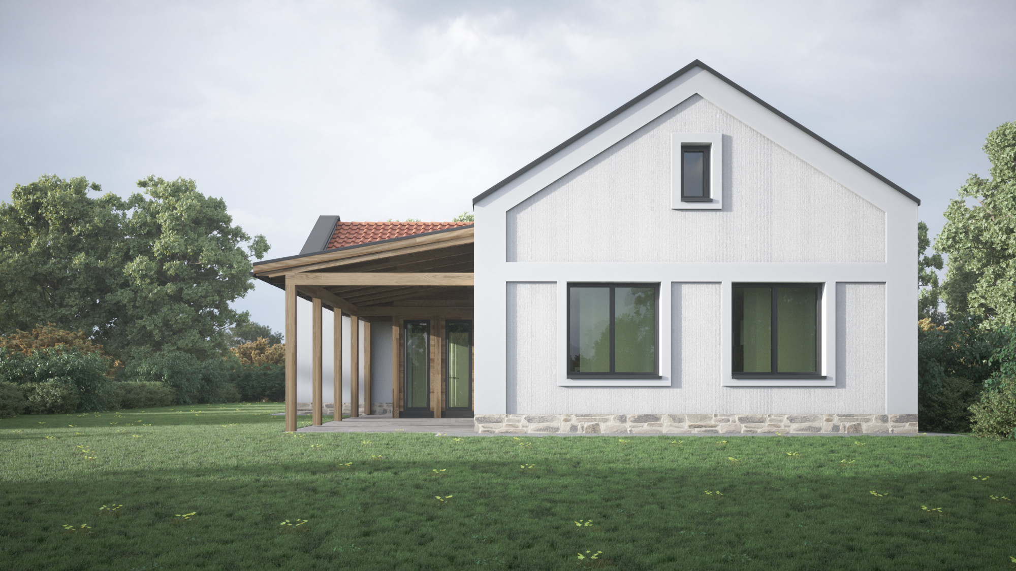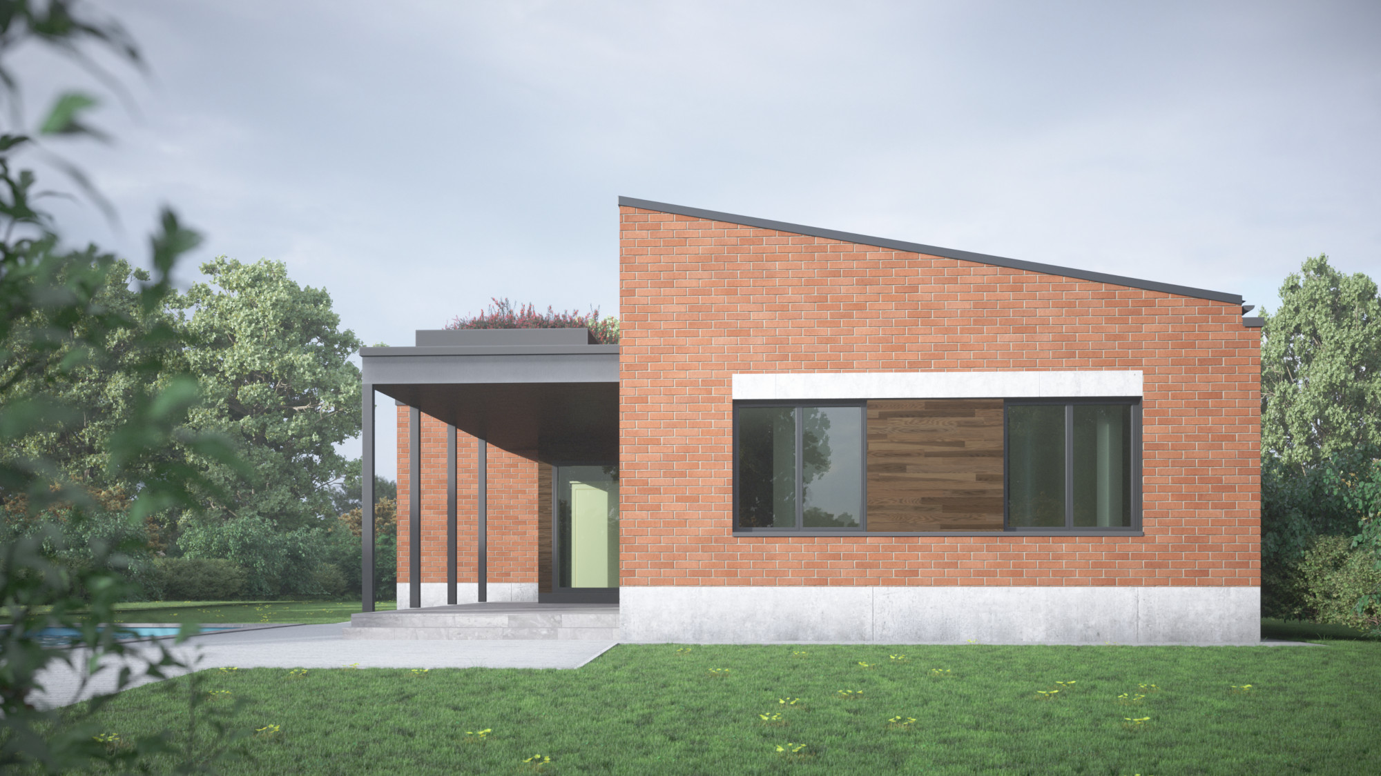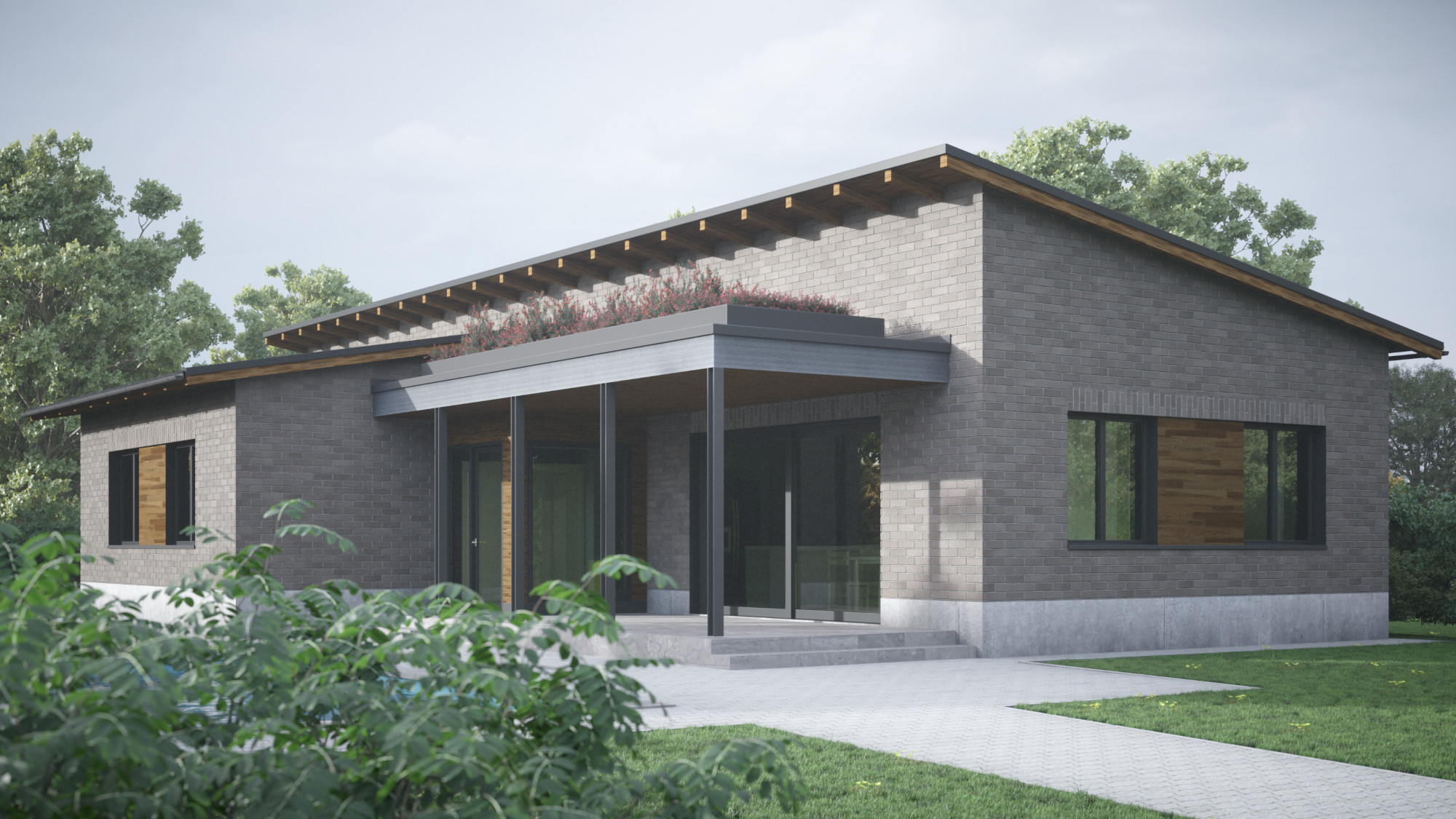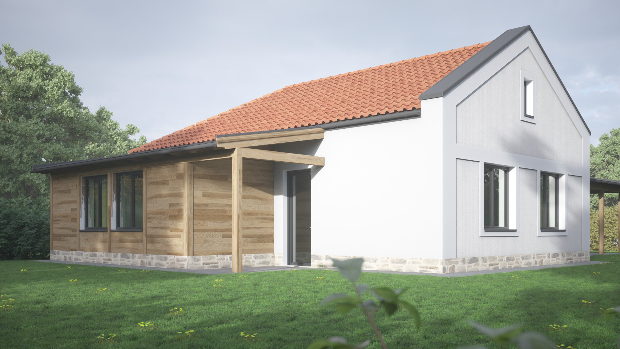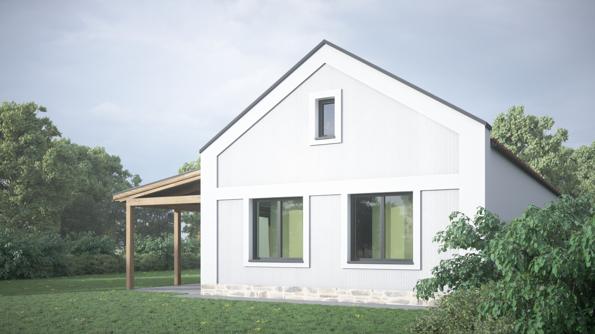 Több változatban készítettünk tervvázlatokat egy földszintes elrendezésű családi házra. Megrendelőnk kérésére különböző építészeti stílusokat próbáltunk ki ugyanarra az alaprajzi beosztásra, bemutatva, hogyan formálja az épület karakterét a homlokzatképzés és az anyaghasználat.