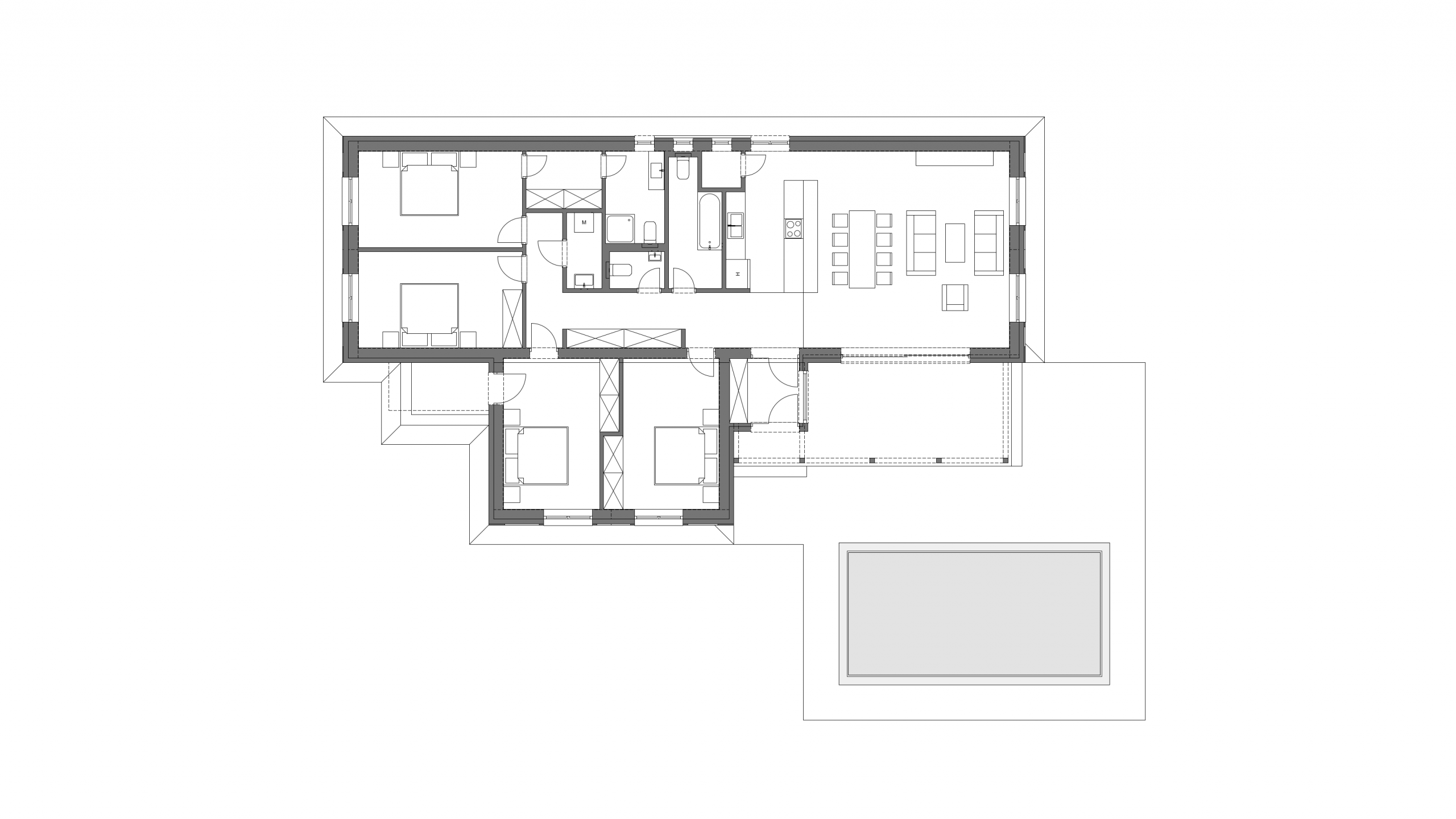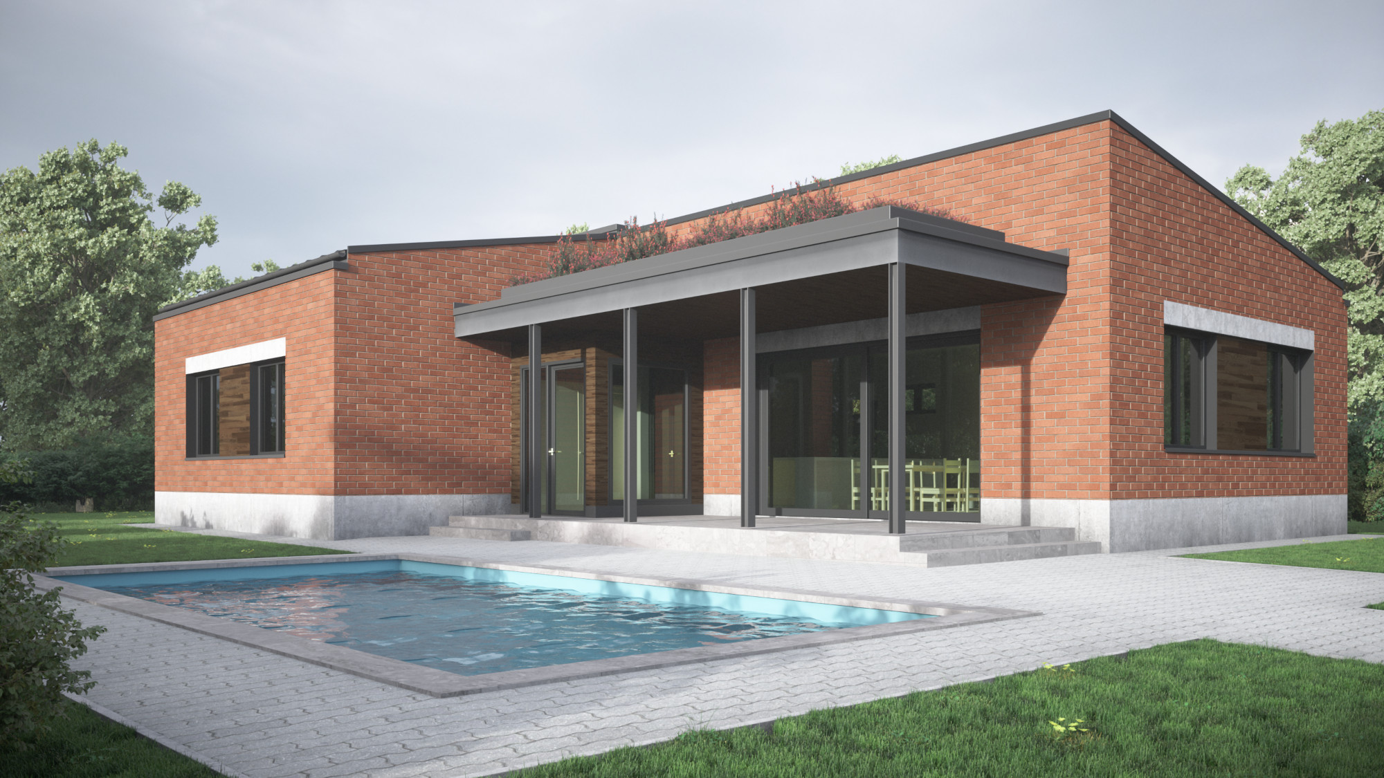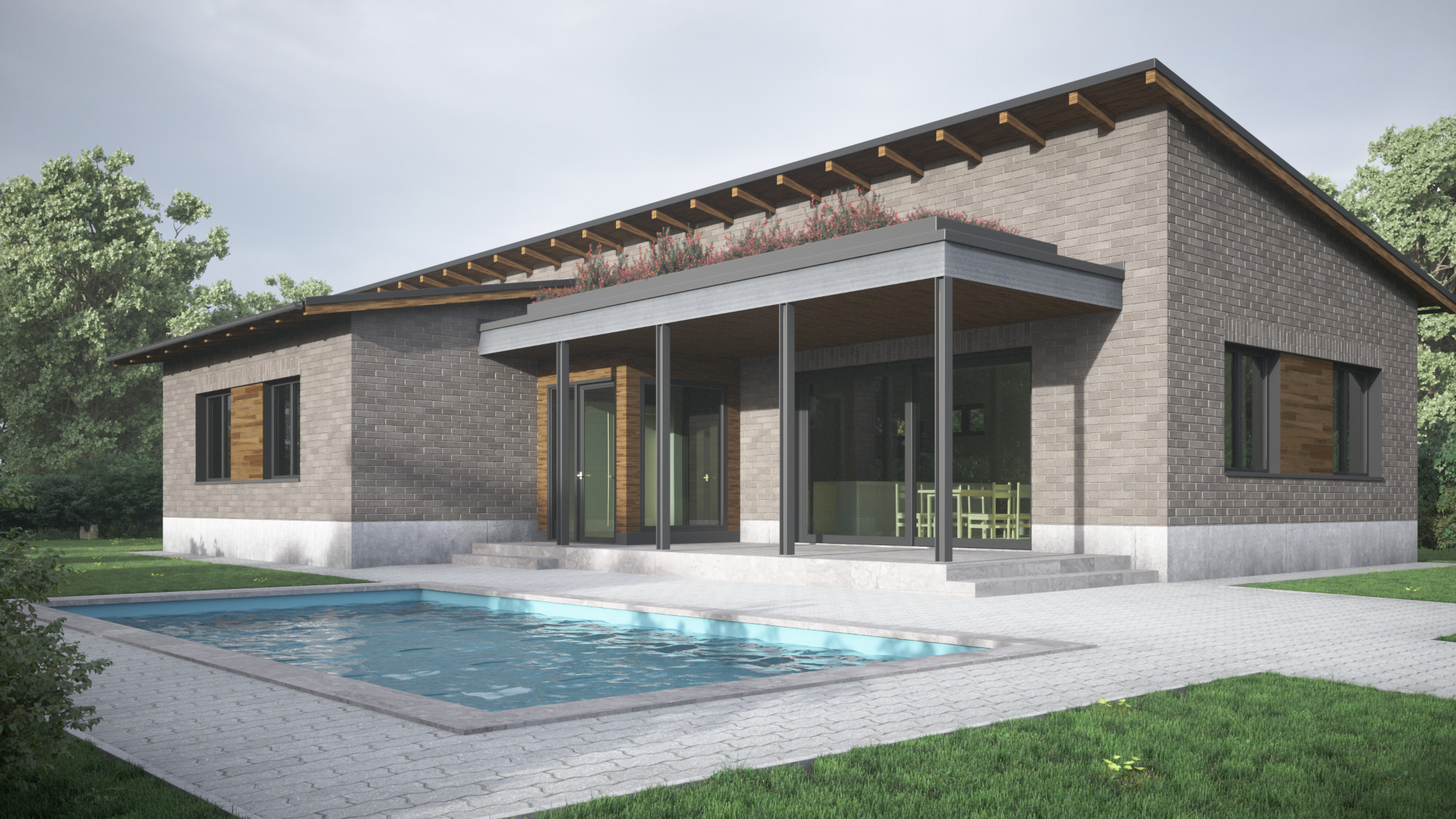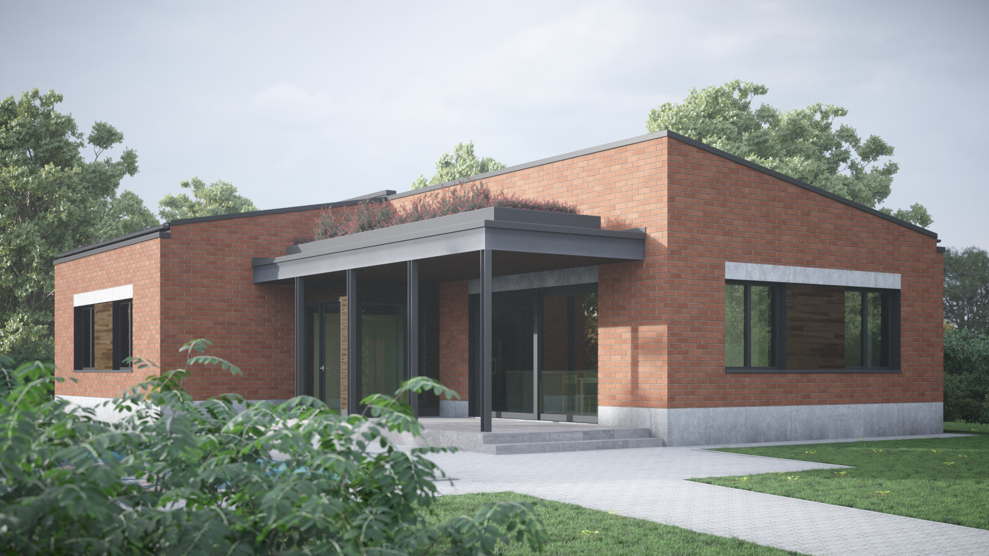 Több változatban készítettünk tervvázlatokat egy földszintes elrendezésű családi házra. Megrendelőnk kérésére különböző építészeti stílusokat próbáltunk ki ugyanarra az alaprajzi beosztásra, bemutatva, hogyan formálja az épület karakterét a homlokzatképzés és az anyaghasználat.