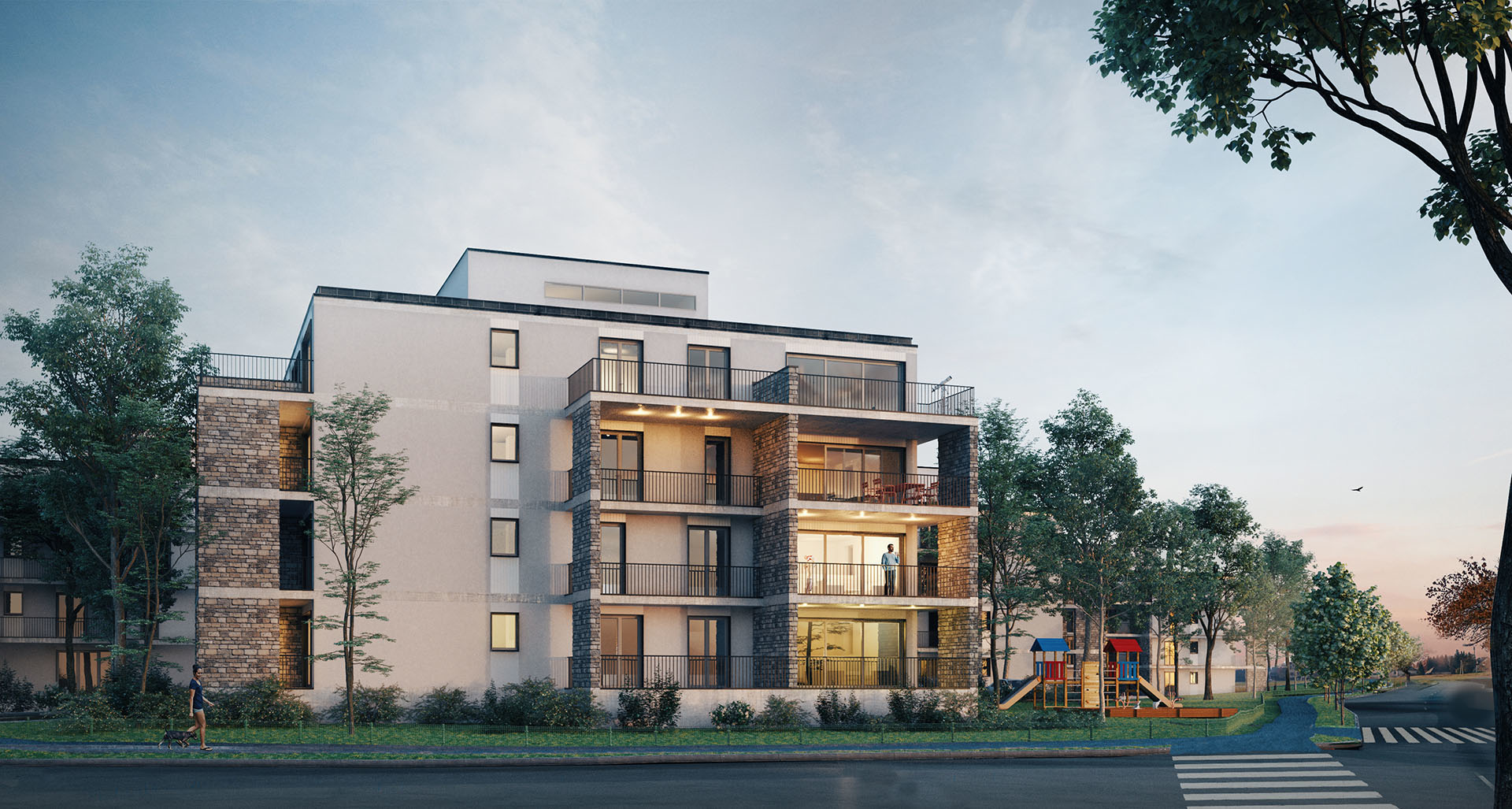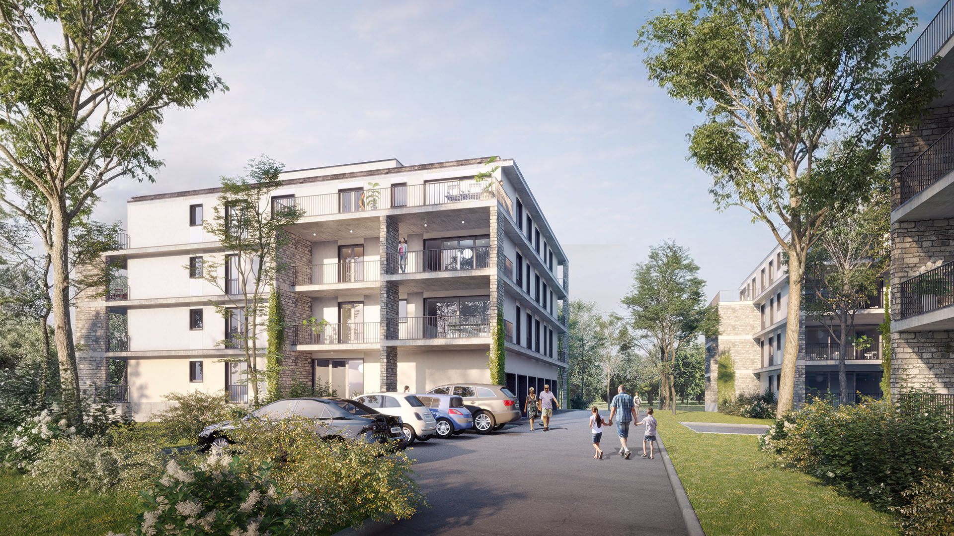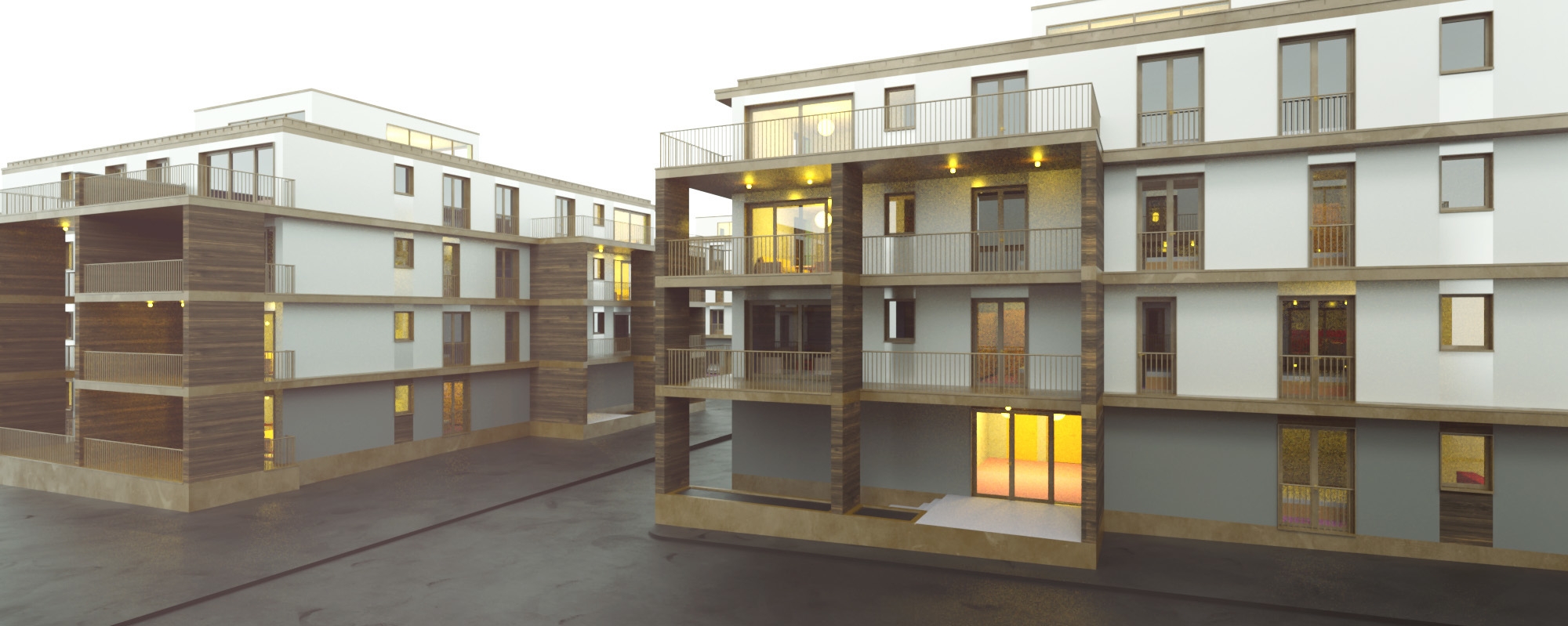 Az épületek fogatolt szerkesztési elve lehetővé tette, hogy a sarokhelyzetű nagyobb lakások két homlokzati irányba legyenek tájolhatók. A felvonót nem a központi, belső háromkarú lépcsőházi orsótérbe helyeztük, így a felső megvilágítás révén a közös használatú belső közlekedőtér világos és átlátható maradt.