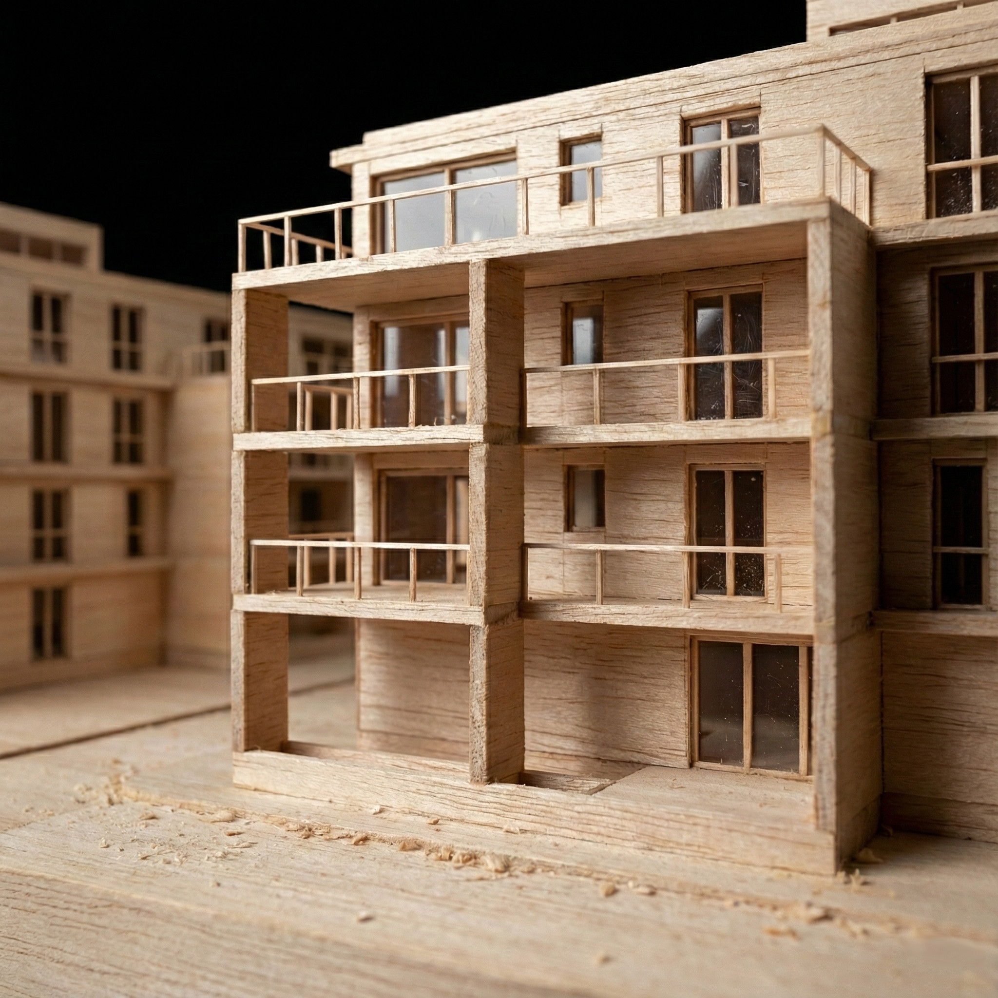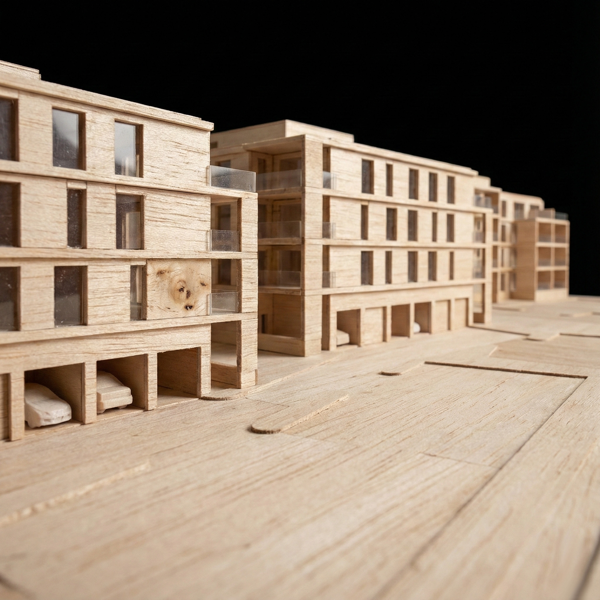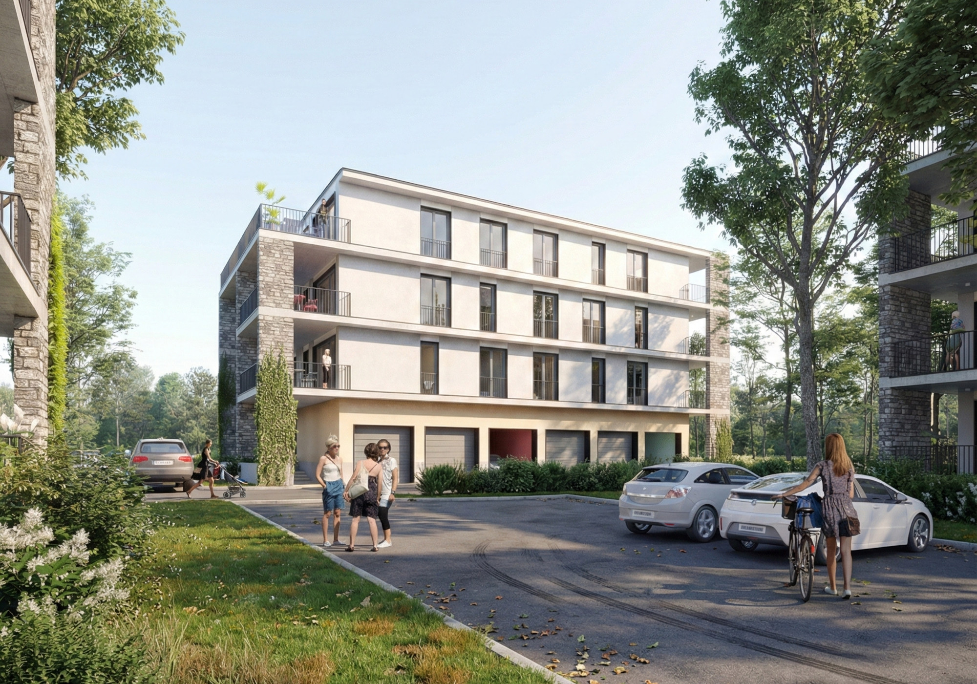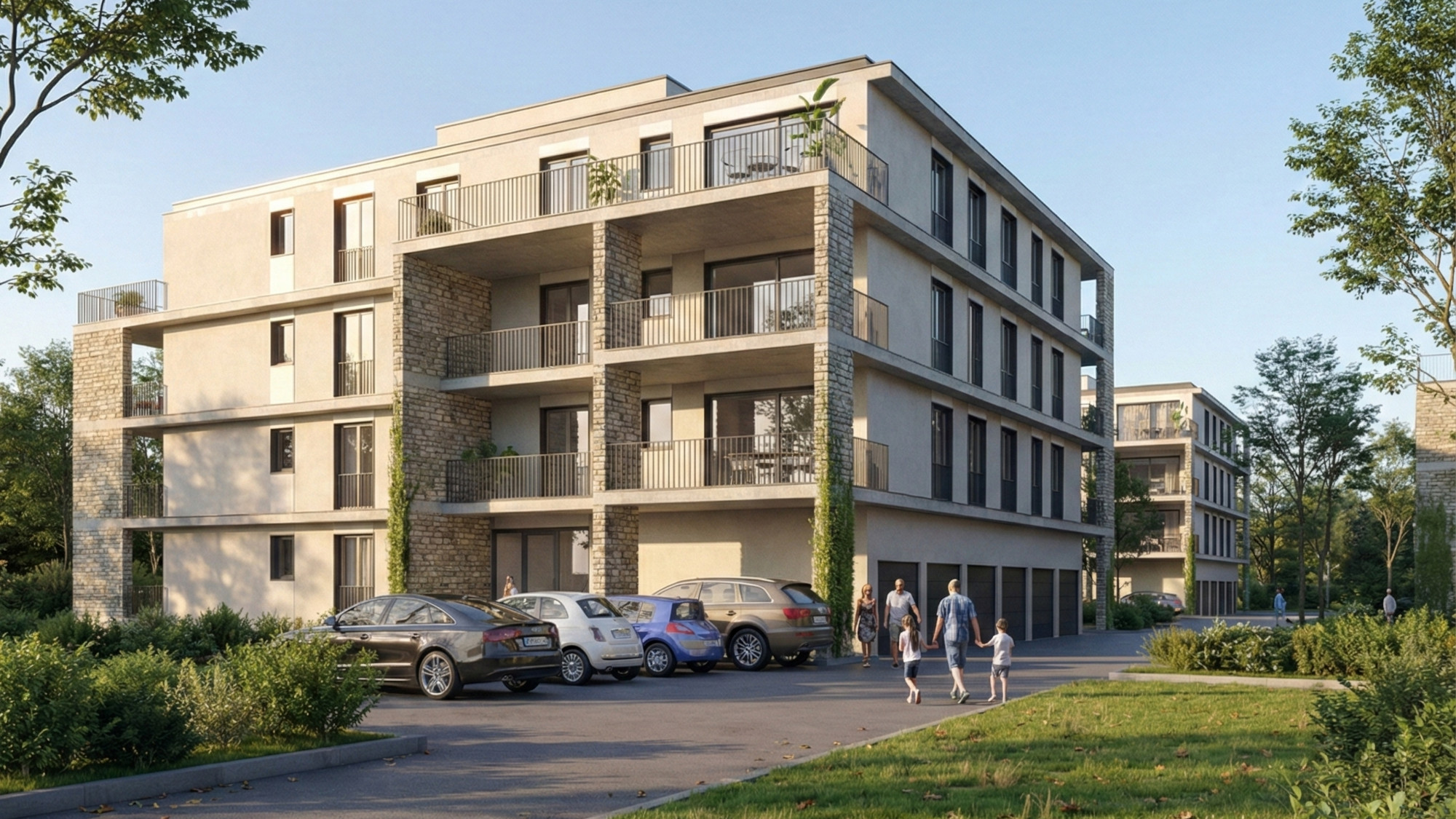 Az épületek fogatolt szerkesztési elve lehetővé tette, hogy a sarokhelyzetű nagyobb lakások két homlokzati irányba legyenek tájolhatók. A felvonót nem a központi, belső háromkarú lépcsőházi orsótérbe helyeztük, így a felső megvilágítás révén a közös használatú belső közlekedőtér világos és átlátható maradt.
