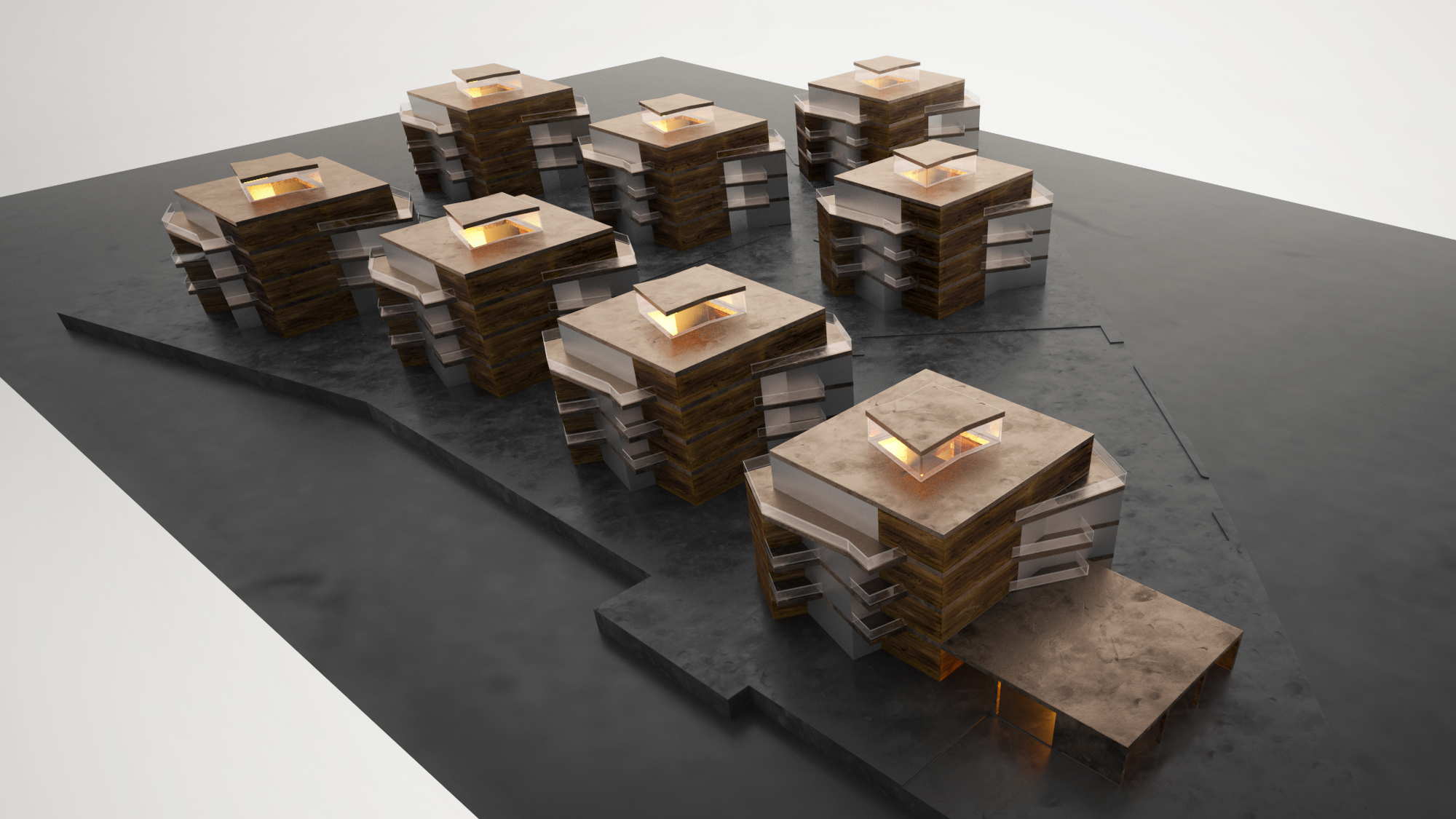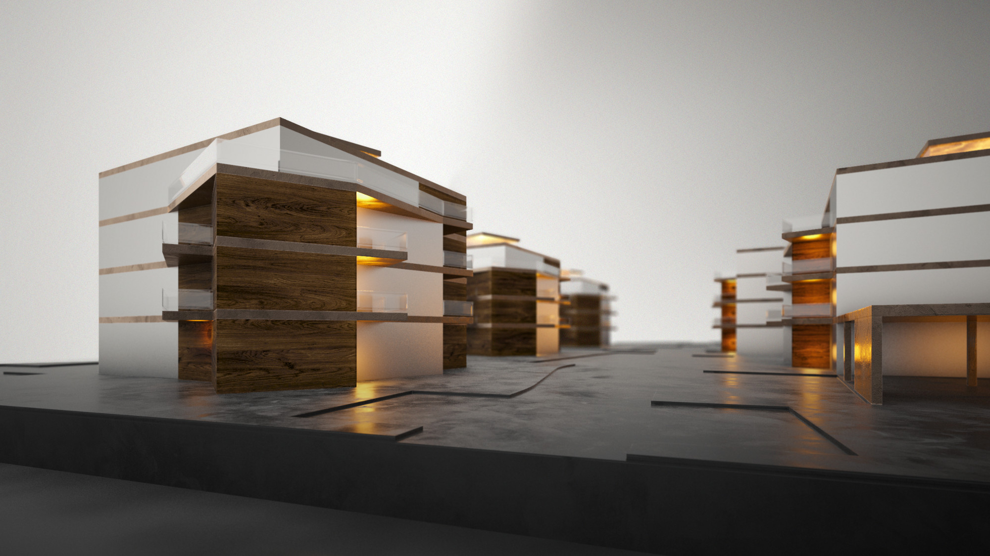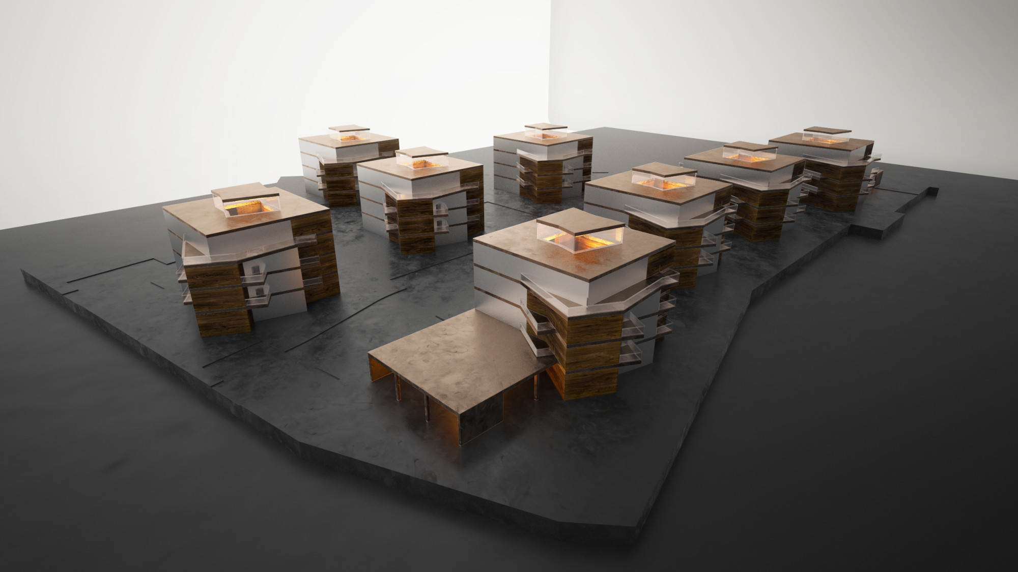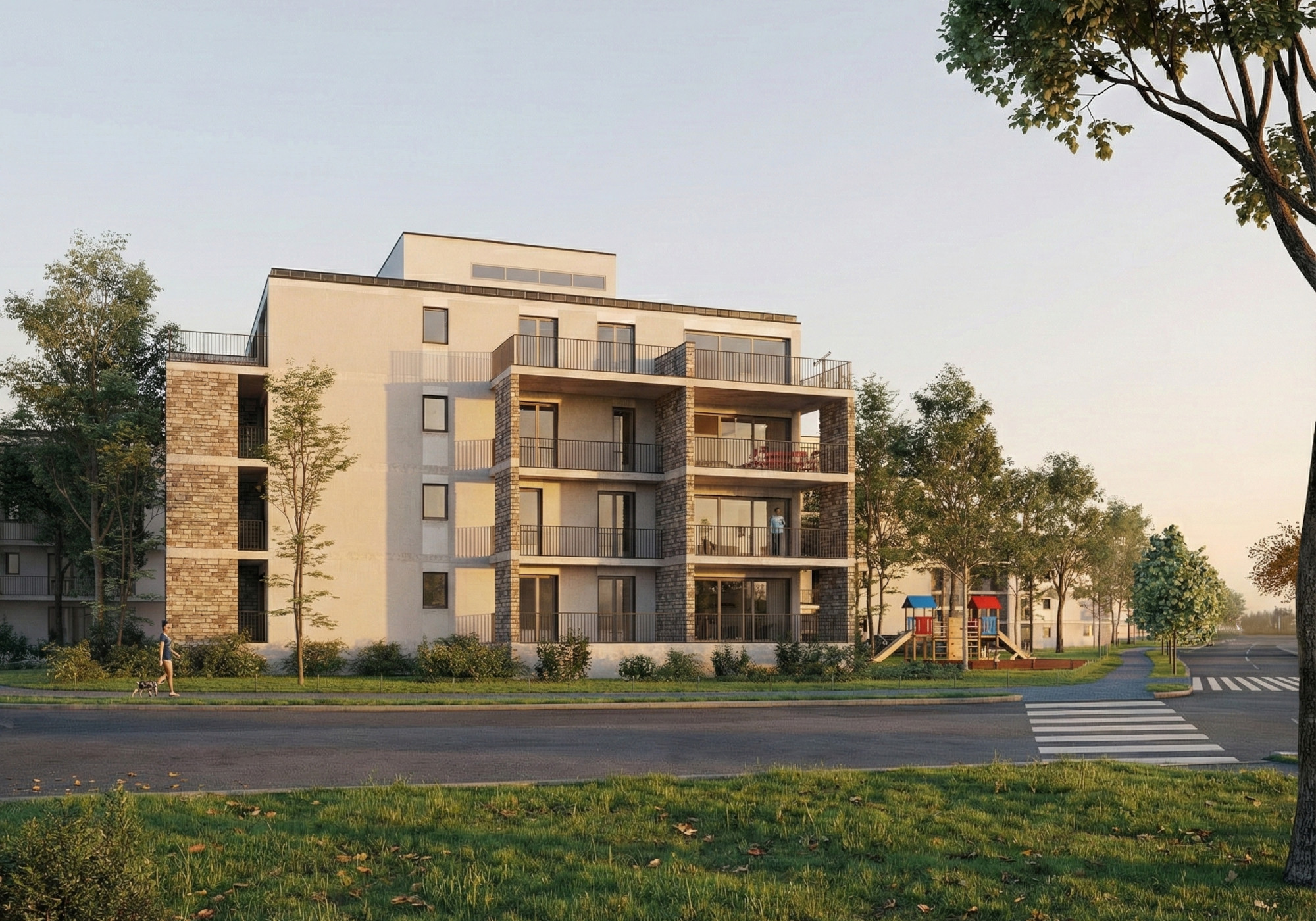 A területen olyan fogatolt rendszerű pontházakat terveztünk, amelyek átmenetet képeznek az északi irányban található szalag- és sorházas beépítésű lakóépületek, és a déli irányban kapcsolódó családi házas övezetek között. Az intenzív beépítés a fejlesztés alapvető elvárása volt, emellett kiemelt szerepet kapott a kivitelezés jó ütemezhetősége.